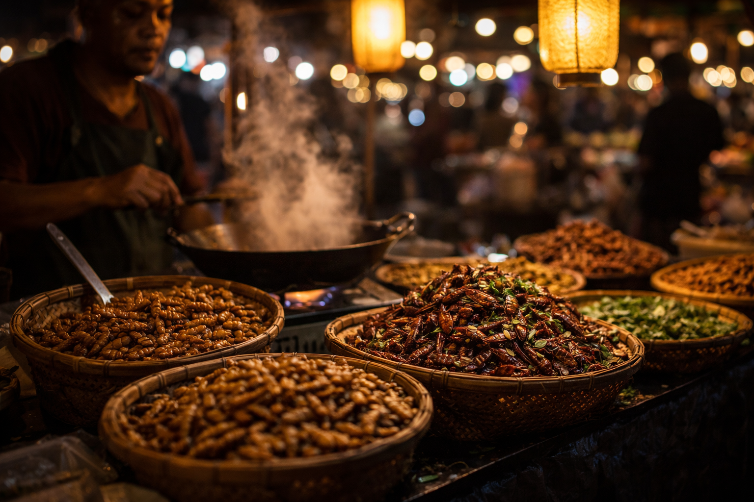 Thaïlande : Les marchés de nuit regorgent de stands d'insectes. Les sauterelles grillées (takatan) sont vendues comme des cacahuètes. Les punaises d'eau géantes (maeng da) — oui, ça existe — ont un goût de réglisse/anis. Les Thaïlandais ne les mangent pas par tradition folklorique : c'est simplement une protéine alternative abordable, dispo localement, délicieuse quand bien préparée.